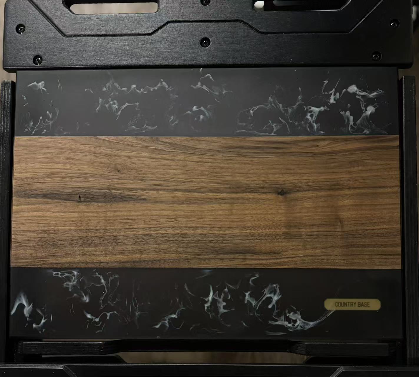 深く重厚な表情を見せるブラックウォールナットの木目、その両脇を包むように流れるレジンには、穏やかな海面に映る雲の様な繊細な模様を閉じ込めました。