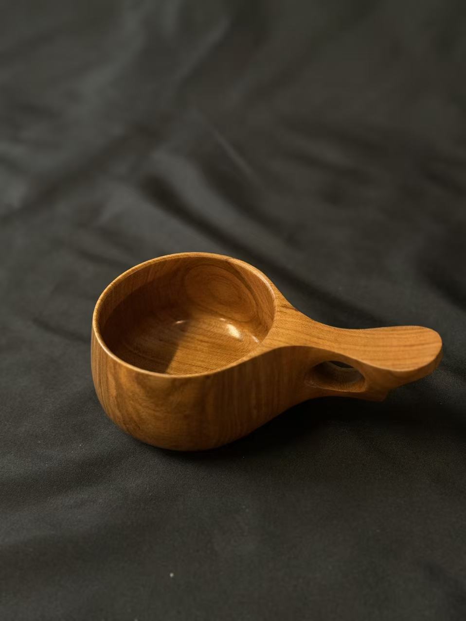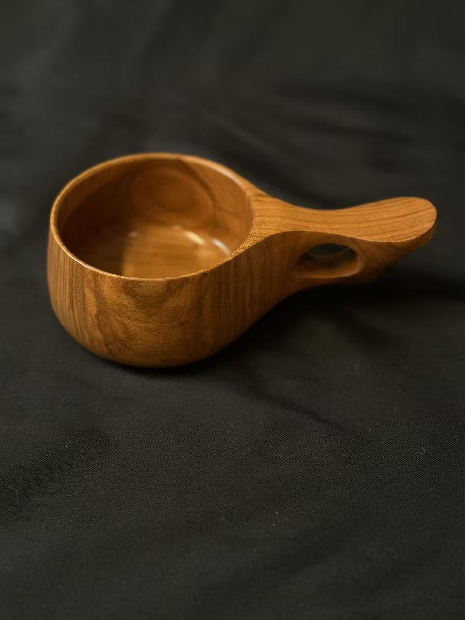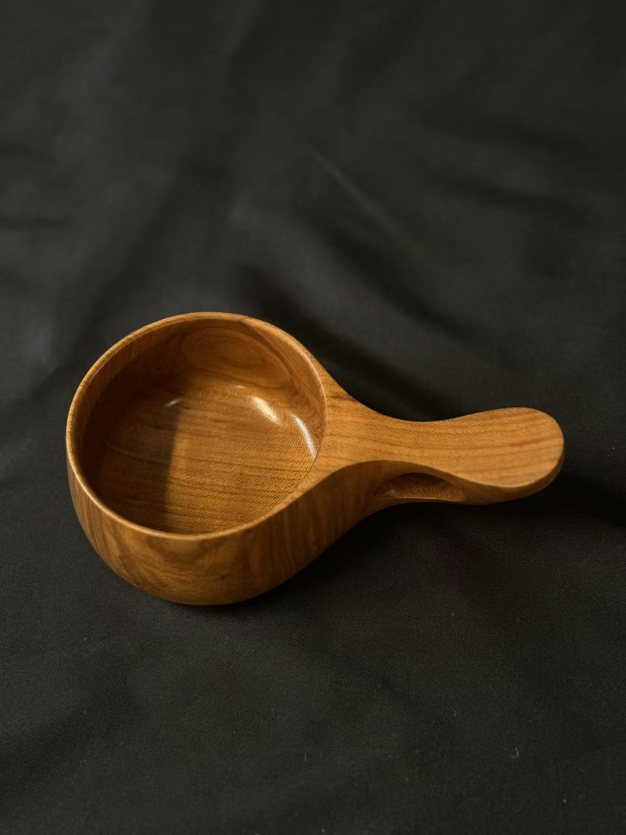 山桜の木から削り出したカッで、ガラス塗料で仕上げてありますので